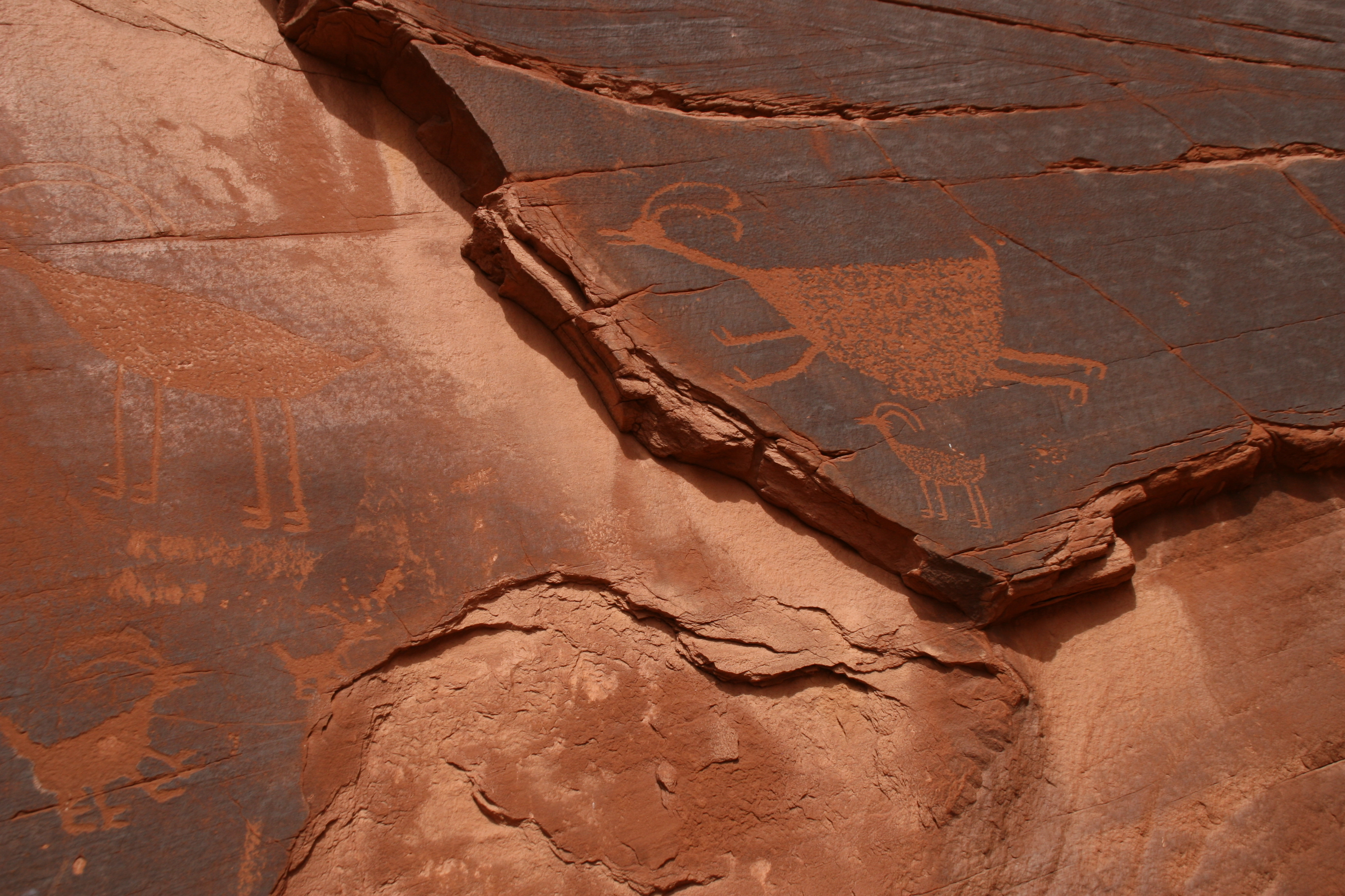 After a sandwich he said, “now we start the real tour,” Mystery Valley, where he grew up. The 4-wheel drive Jeep was amazing, through drifts of red sand, along wet and dry creek beds, up steep mountain paths, across the tops of mesas, forging our own road as we went. We explored ancient cliff dwellings where Anasazi Indians lived a thousand years ago, though there is evidence of a human population in the Valley for over 14,000 years. Vernon took me to fractured rocks where ancients painted petroglyphs of birds and antlered animals, hand prints and men with shields and spears.