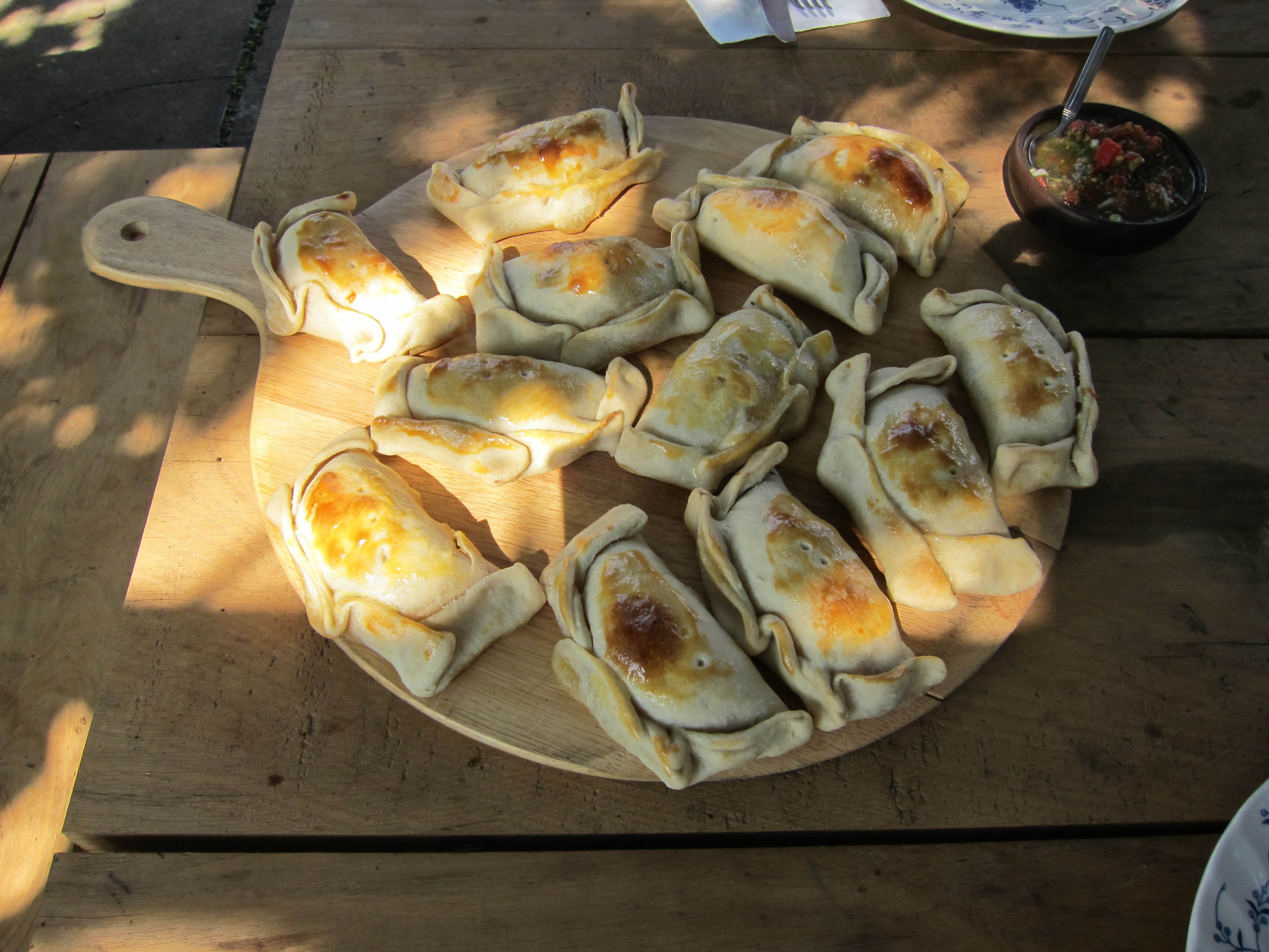 Around seven o’clock, tour leader Mac suggested we stop for take-out empanadas as we would likely be hungry later. Oscar knew the perfect place. It was like a McDonald’s roadside fast-food eatery except they made and sold only empanadas. The place was jammed and there were three men in the lot directing cars to available parking spaces. Oscar and Mac came back with a covered box full of aromatic empanadas.